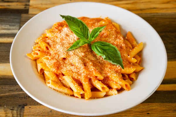Penne alla vodka is a pasta dish tossed in a creamy tomato-based vodka sauce, with a touch of parmesan.